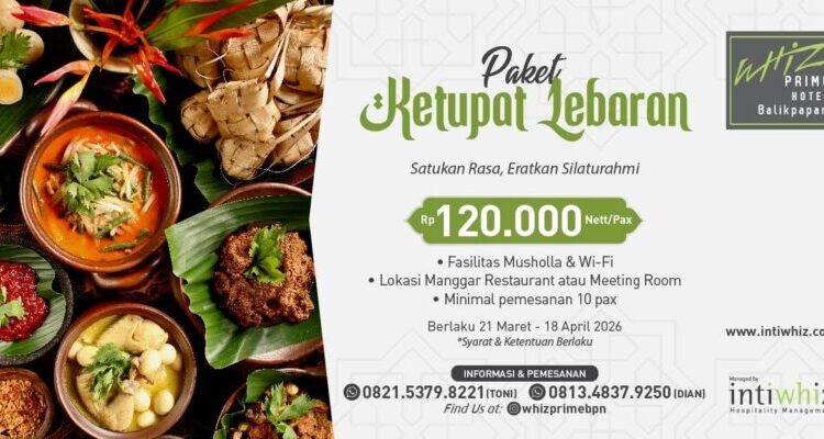 Whiz Prime Hotel Balikpapan Hadirkan Paket “Ketupat Lebaran”, Solusi Halalbihalal Praktis dan Nyaman Balikpapan – Menyambut momen Hari Raya Idul Fitri, Whiz Prime Hotel Balikpapan menghadirkan promo spesial bertajuk “Paket Ketupat Lebaran” yang ditujukan bagi masyarakat yang ingin menggelar acara halalbihalal bersama keluarga, sahabat, maupun rekan kerja. Melalui paket ini, tamu dapat menikmati hidangan khas Lebaran dengan harga Rp120.000 nett per orang. Paket tersebut sudah termasuk fasilitas musholla dan Wi-Fi, serta pilihan tempat di Manggar Restaurant maupun meeting room yang nyaman untuk kegiatan berkumpul. Promo ini tersedia dengan minimal pemesanan 10 orang, sehingga cocok untuk berbagai kegiatan silaturahmi dalam suasana Lebaran. Paket Ketupat Lebaran berlaku mulai 21 Maret hingga 18 April 2026, memberikan kesempatan bagi masyarakat untuk merayakan kebersamaan lebih lama setelah Hari Raya. Sales Marketing Manager Whiz Prime Hotel Balikpapan, Toni Setiawan, mengatakan paket ini dihadirkan sebagai solusi praktis bagi masyarakat yang ingin menggelar acara tanpa harus repot mempersiapkan berbagai kebutuhan. “Melalui Paket Ketupat Lebaran ini, kami ingin menghadirkan tempat yang nyaman bagi masyarakat untuk berkumpul dan mempererat silaturahmi tanpa harus repot mempersiapkan segala sesuatunya. Kami berharap paket ini dapat menjadi pilihan bagi keluarga maupun perusahaan yang ingin mengadakan acara halalbihalal di Whiz Prime Hotel Balikpapan,” ujarnya. Whiz Prime Hotel Balikpapan merupakan hotel bintang tiga yang berlokasi di pusat kota dan dilengkapi berbagai fasilitas seperti ruang pertemuan, restoran, hingga layanan penunjang lainnya yang mendukung kenyamanan tamu. Hotel yang dikelola oleh Intiwhiz Hospitality Management ini terus berkomitmen menghadirkan pelayanan profesional serta berbagai promo menarik bagi masyarakat, khususnya dalam momen spesial seperti Lebaran. Untuk informasi dan reservasi, masyarakat dapat menghubungi pihak hotel melalui nomor yang tersedia atau media sosial resmi Whiz Prime Hotel Balikpapan. Berita|17/03/2026oleh Rie