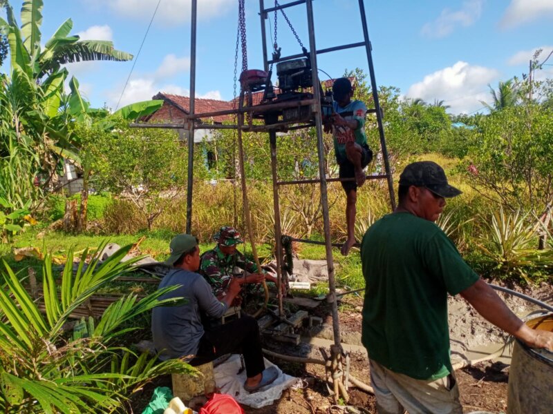 Tampak di lapangan, anggota Satgas TMMD bekerja sama dengan masyarakat setempat melakukan proses pengeboran sumur. Dengan peralatan sederhana dan semangat gotong royong, mereka bahu membahu menggali tanah demi menemukan sumber air yang nantinya akan dimanfaatkan seluruh warga desa.