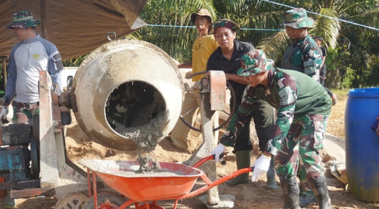 Suasana kebersamaan pun terlihat di lokasi kegiatan. TNI dan masyarakat bekerja berdampingan, saling membantu serta berbagi tugas demi mempercepat proses pembangunan infrastruktur desa yang sangat dibutuhkan warga.