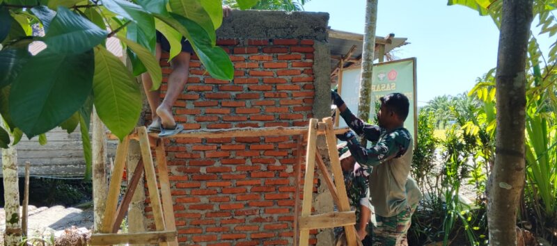 Di lokasi pekerjaan, Minggu (22/2/2026), anggota Satgas terlihat merapikan plester dinding bangunan MCK. Tahapan tersebut dilakukan setelah proses pengecoran slup selesai, sebagai bagian dari upaya menyempurnakan bangunan agar kokoh dan siap digunakan masyarakat.